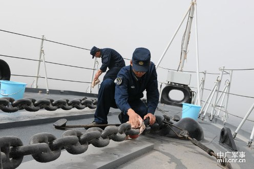 3月21日,海軍第十一護航編隊首次獨立執(zhí)行護航任務(wù)。受沙塵暴影響,能見度降低。圖為“青島”艦官兵在清潔掃除。米晉國攝影