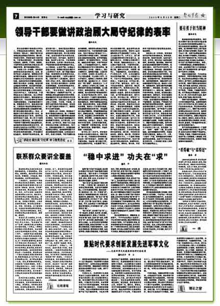 軍隊(duì)各級(jí)領(lǐng)導(dǎo)干部是部隊(duì)的帶兵人,無(wú)疑也應(yīng)當(dāng)成為講政治、顧大局、守紀(jì)律的“排頭兵”。領(lǐng)導(dǎo)干部只有自覺(jué)響應(yīng)胡主席提出的講政治、顧大局、守紀(jì)律的要求,積極參加學(xué)習(xí)教育活動(dòng),不斷強(qiáng)化政權(quán)意識(shí)、責(zé)任意識(shí)和憂患意識(shí),高標(biāo)準(zhǔn)、嚴(yán)要求、做模范,才能帶領(lǐng)官兵把我軍真正建設(shè)成為軍魂意識(shí)牢固、履行使命堅(jiān)強(qiáng)的軍隊(duì)。