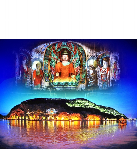 夜色下的龍門(mén)在各色燈光的映照下美輪美奐,萬(wàn)千佛陀現(xiàn)金身。記者 陳曉東 攝 啟天 制圖