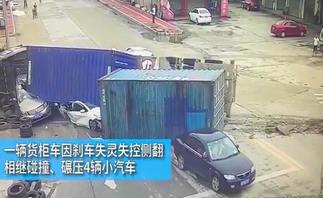 貨車側(cè)翻沖向車群 壓扁兩轎車
