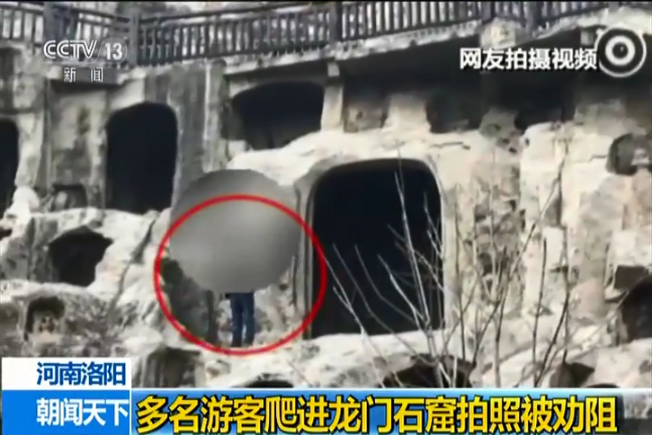 游客爬進(jìn)龍門(mén)石窟拍照被勸阻
