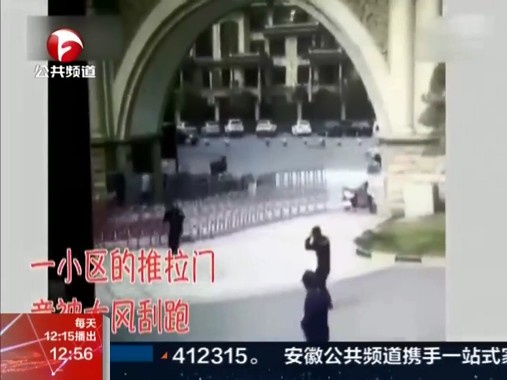 小區(qū)大門被風吹跑 保安緊追