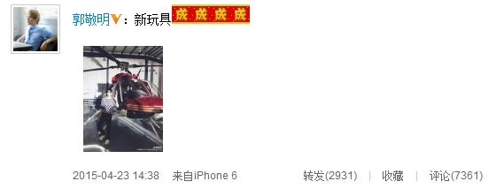 4月23日下午,郭敬明在微博曬出一張與一架直升機的合照,炫富炫出了新高度。