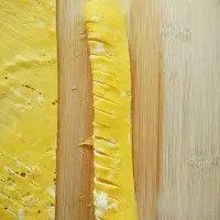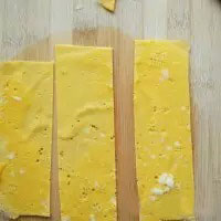1. 雞蛋打散加少許鹽,淀粉加少許水調勻,加在蛋液中攪拌均勻,平底鍋小火,倒入蛋液,煎成薄薄的蛋皮,切成寬約4厘米的長條。