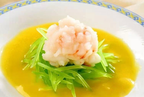 1、蝦肉剁成泥,加入香菜,下入90°水中汆熟。