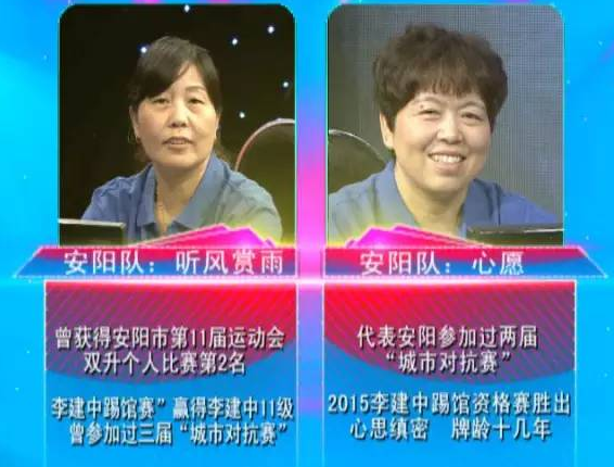 雖然來的是兩名女隊員,但是人家巾幗不讓須眉?!奥狅L賞雨”曾獲得安陽市第11屆運動會雙升個人比賽第2名;2015年“李建中踢館賽”領先李建中11級;參加過三次“河南電視雙升城市對抗賽”?!靶脑浮痹?015年“李建中踢館資格賽”中勝出;代表安陽隊參加過兩屆“河南電視雙升城市對抗賽”,牌齡十幾年。