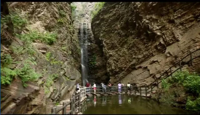 瀑布高達(dá)100余米,從井口水簾洞落下,形成了自然奇觀,漫步在棧道之上,便有穿云破霧之感。在這里,遠(yuǎn)望可領(lǐng)略高山整體氣勢(shì)之壯美,近觀可品察,山石樹(shù)木形色質(zhì)紋之奇秀。