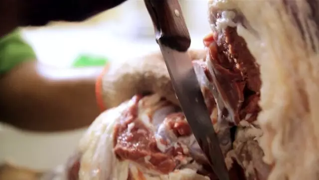 選用本地兩個月的小山羊,據(jù)說體重在40斤左右的口感最好,每天下午進(jìn)行阿訇宰后,肥瘦相間的羊肉就送到了果園,師傅叉起一塊羊油開始抹,這動作看的吃貨一頭霧水。
