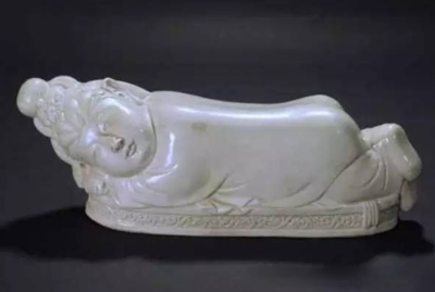 這件宋定窯“美人枕”,長43厘米,寬15.5厘米,質(zhì)地細(xì)膩,釉色白潤如玉,工藝精巧。此枕塑造了一個豐滿美人的“迷人睡姿”—其雙手枕于頭下,兩腳疊壓稍稍抬起,衣紋線條流暢,盡顯雍容華貴,透露出唐人遺風(fēng)。