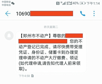 大河報記者了解到,鄭州市不動產(chǎn)登記中心目前正式推出了業(yè)務(wù)辦結(jié)的短信提醒服務(wù)。當(dāng)不動產(chǎn)登記部門在辦結(jié)申請人的相關(guān)申請后,便會給申請人(代理人)發(fā)去短信,提醒其及時前往不動產(chǎn)登記部門領(lǐng)取不動產(chǎn)登記證書、證明?!皬臉I(yè)務(wù)辦結(jié)到領(lǐng)證還有一些內(nèi)部流轉(zhuǎn)程序,一般情況下,我們都是在繕證完成后24小時發(fā)送短信?!毕嚓P(guān)負(fù)責(zé)人介紹說。