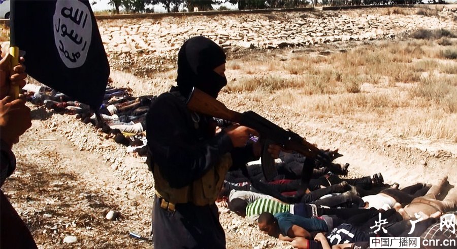 當?shù)貢r間2014年6月14日,伊拉克薩拉赫丁,伊拉克極端武裝“伊拉克和黎凡特伊斯蘭國”武裝人員處決大量俘虜?shù)囊晾耸勘??!?
