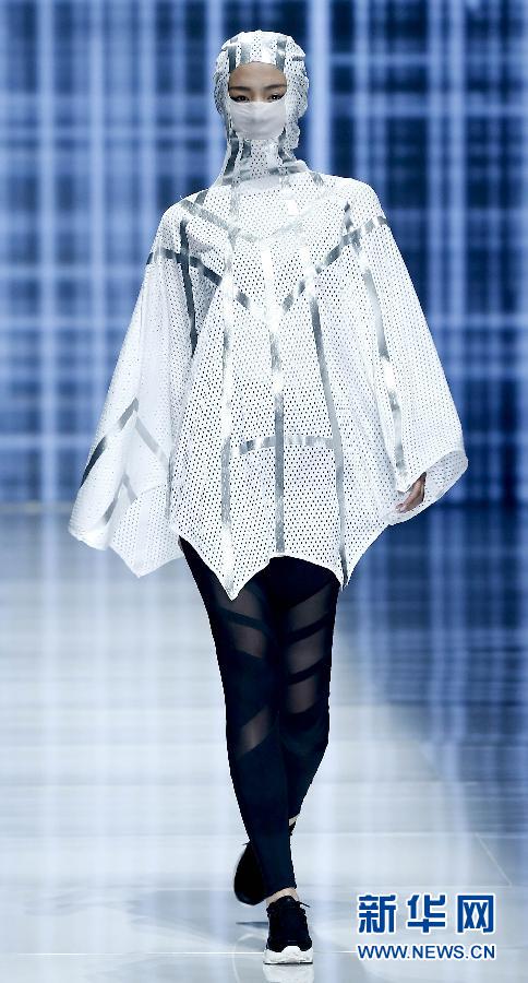 10月28日,模特在北京舉行的中國國際時(shí)裝周“喬丹·尹鵬運(yùn)動(dòng)裝發(fā)布會”上,展示設(shè)計(jì)師尹鵬設(shè)計(jì)的搭配各種“口罩”的運(yùn)動(dòng)裝。新華社記者陳建力攝