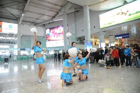 為穩(wěn)定旅客情緒,大連機(jī)場請來美女拉拉隊(duì)員跳操,引來眾多旅客圍觀。新青年網(wǎng)