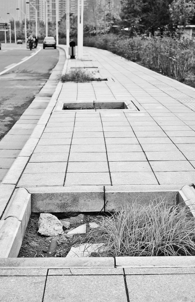 樹(shù)坑內(nèi)沒(méi)有種樹(shù),長(zhǎng)了野草。